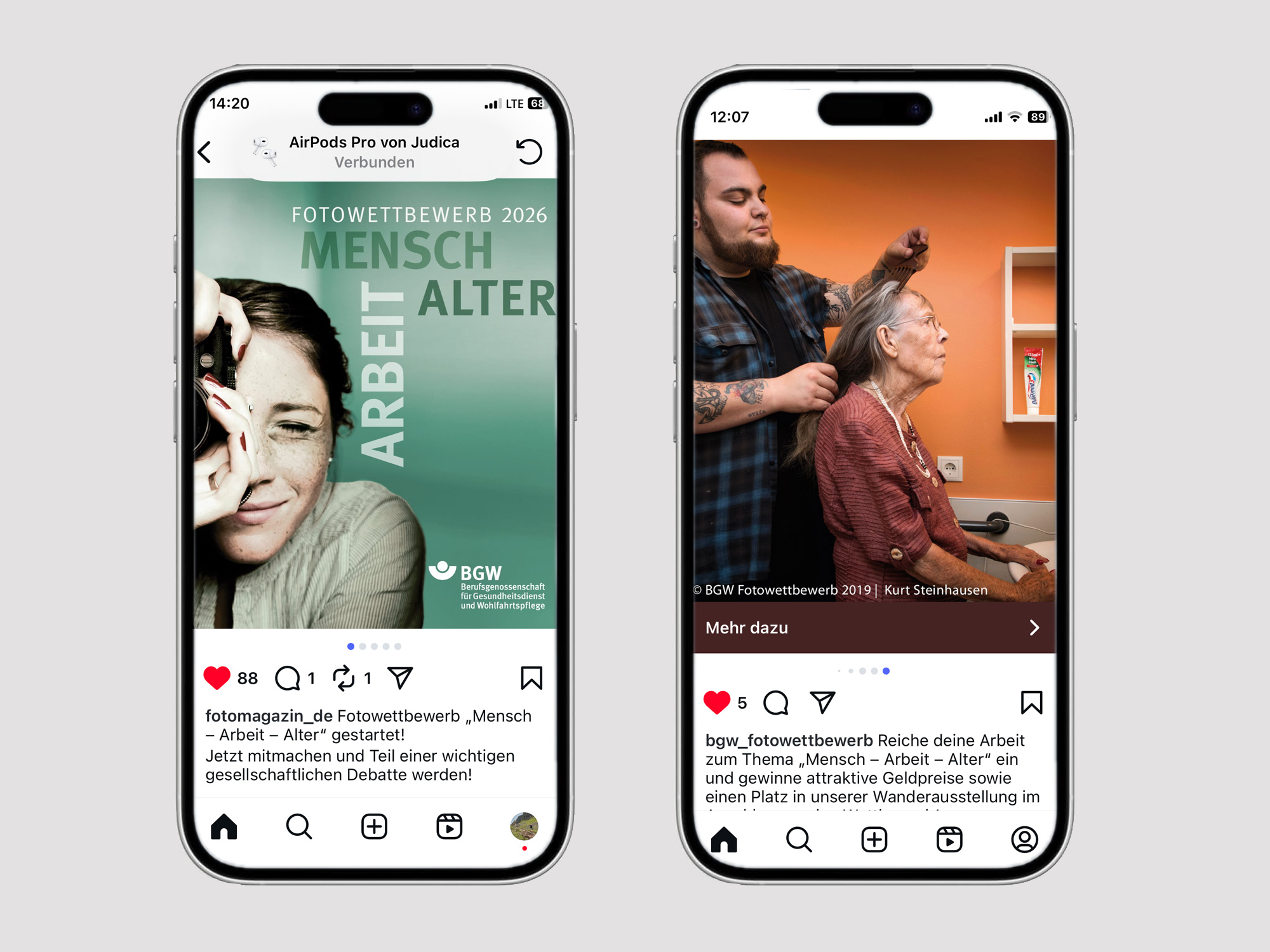 Die BGW ist Trägerin der gesetzlichen Unfallversicherung im Gesundheitsdienst und in der Wohlfahrtspflege. Seit 2017 lädt sie Fotoschaffende zu Wettbewerben unter wechselnden Leitthemen wie „MENSCH–ARBEIT–HANDICAP“, „MENSCH–ARBEIT–ALTER“ und „MENSCH–ARBEIT–ZUKUNFT“ ein. Ziel ist es, gesellschaftliche Diskurse rund um Inklusion, Pflege und Erziehung sichtbar zu machen.